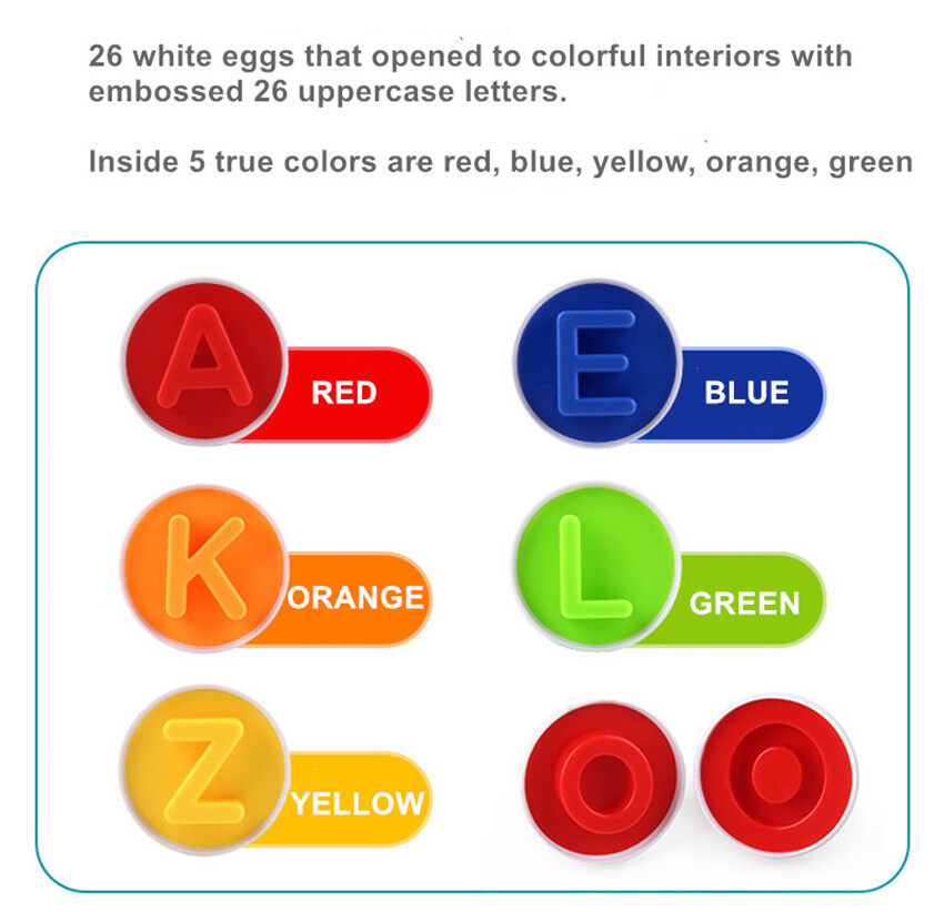 Eggs-ellent Toy: An instant hit and amazing improvement of matching eggs! 26 white eggs that opened to colorful interiors with embossed 26 uppercase letters. Inside 5 true colors are red, blue, yellow, orange, green. Match the alphabet by the interior color and letters’ shape of the "yolk" and then works at connecting the pieces together. The carton measures 11.6x9.8x2.8in, weigh 25.5oz.