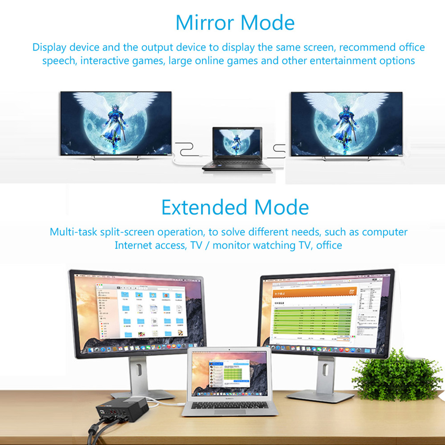 With one simple USB cable, you can access to up to two Full-HD displays(HDMI and DVI-I) for mirroring/extending your desktop to external monitors, as well as Gigabit Ethernet network, microphone, speakers, external hard drive, optical disk drive, printers, USB keyboard, mouse and many other USB devices.