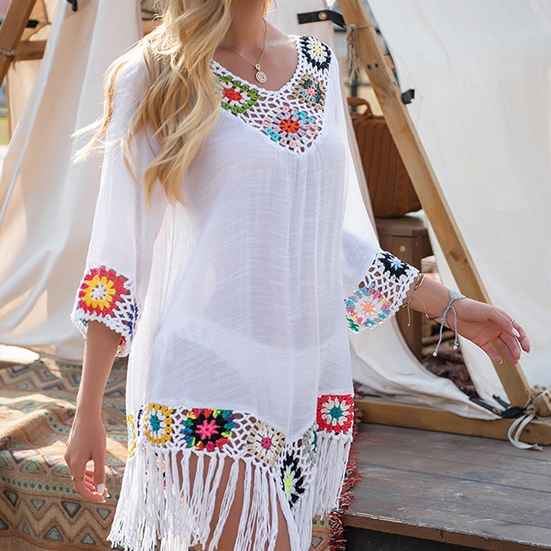 Features: V-neck, see-through, fringe, solid color, loose, crochet eyelet, hollow, stylish and unique, can help improve women's charm.