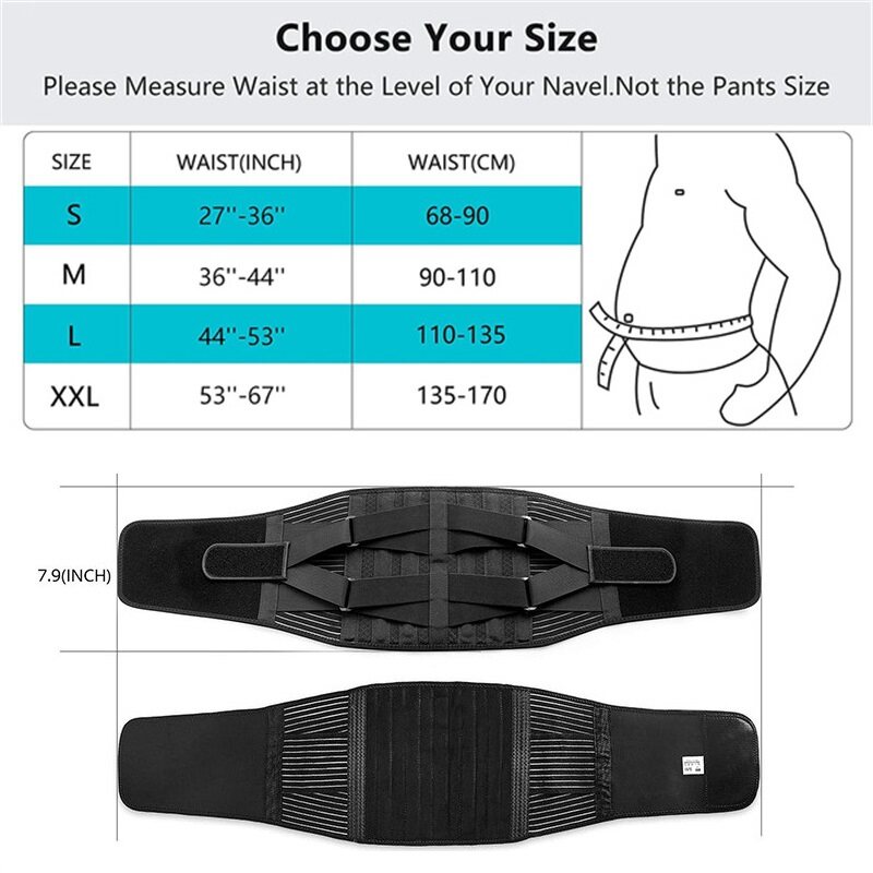 Features: [Take Pain Away Immediately]: The back brace contains 4 PP stays and 2 steel springs placed along the waist side,providing 360° stronger support to lower back,and relieving back pain caused by arthritis,disc herniation,sciatica,spinal stenosis,scoliosis,and ankylosing spondylitis,etc. [Most Breathable Air Mesh]: The Air-Mesh channels of the brace provide comfort for all-day wear even the toughest work.This back support is made of 4-way stretch tech, which is lightweight and bring you an ultimate baby-skin-like silky touch when wear it under the cloths, perfect for back surgery to restore. [Strongest Extra support]: Back support elastic straps is designed 4 times stronger stretch yarn which easily add extra compression around back, lower back pain relief for men and women while heavy lifting,long time standing or sitting,playing golf,doing housework,gardening,working,etc. [Maximum Stability]: 2 Silicone anti-skid bands are designed on the 2 sides of the waist,preventing back support from riding up when sitting, bending or doing daily activities.The wide size velcro of 2 elastic straps provide maximum stability far beyond your expectations, made of PVC material that usually used for babies clothes,will not scratch your skin or damage your clothes. Specifications: Condition: Band new Type: Back support belt Main material: SBR, Polyester fiber Color: Black Style: Basic, Upgrade Size: As shown (Approx.) Package includes: 1x Back support belt