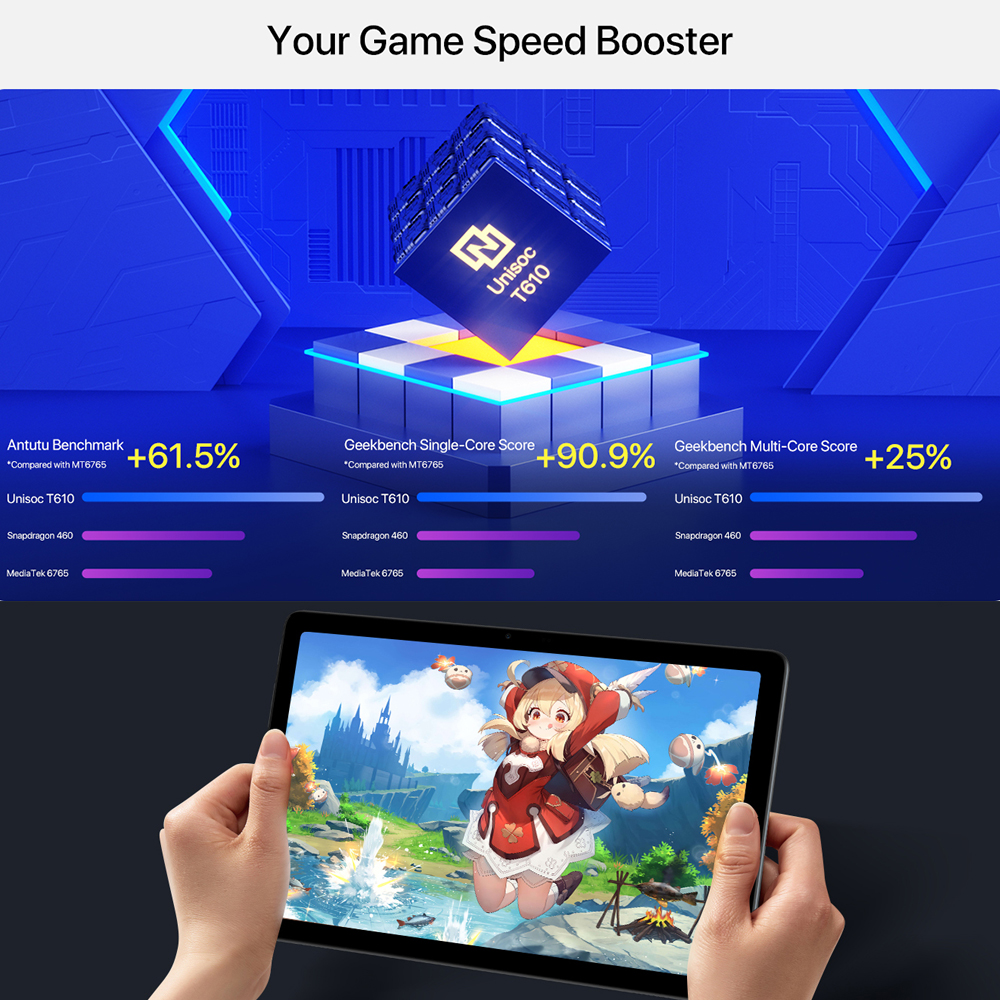 Smile X adopts with 8-core UNISOC Tiger T610 chipset and Mali G52 GPU. The super-fast 12nm processor uses two high-performance A-75 cores and six high-efficiency A-55 cores, maximizing power and battery life. Make the video, games and movies run smoothly. Thanks to the 850Mhz graphics processor, thousands of apps and tools on the Google Play Store are at your fingertips.
