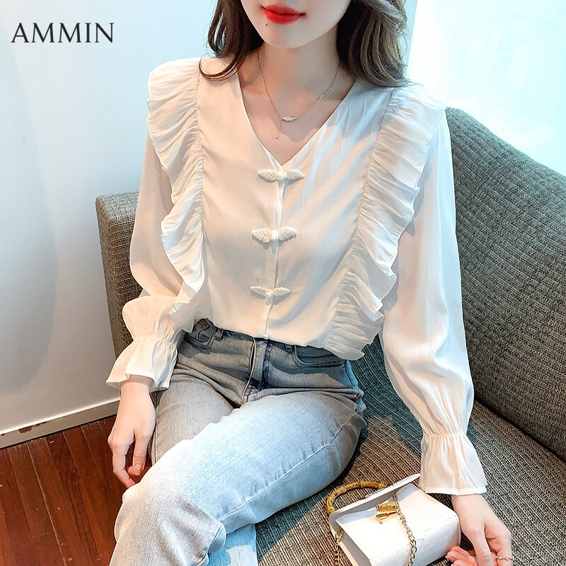 AMMIN 2022 Autumn new sweet chic high-grade white chiffon shirt Korean-style fashion temperament V-neck ruffle lantern sleeve chiffon top For women