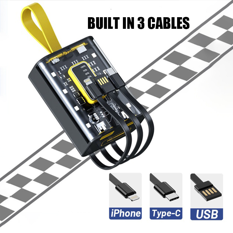 ?SG Ready Stock?20000mah Powerbank Built-in 3 Cables Transparent Cover Fast Charge Power Bank Dual USB Full Capacity Mini Power Bank Mini Power Bank