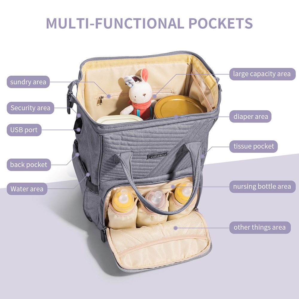 Tote around everything you need for babies, infants, and toddlers with this baby diaper bag backpack that features 13 storage pockets and a USB port, complete with zippers for easy closure and three insulated pockets for bottles, snacks and more.